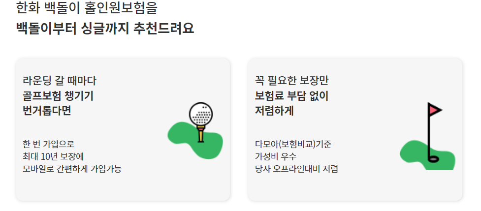 먼저 한화 백돌이 홀인원보험에 대해 알려드리겠습니다. 한 번 가입으로 최대 10년 보장이 가능하며 모바일로 간편하게 가입이 가능하다는 것이 특징입니다. 필요한 보장만 갖추었으며 보험료 부담 없이 저렴하여 보험비교를 하였을 때 가성비가 우수하다고 합니다. 자세히 알아보겠습니다.