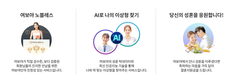 여보야는 성혼지원 프로젝트의 일환으로 결혼을 하게 되면 이용료를 전액 환불해 드리고 있습니다. 결혼지원금과 출산축하금도 지원해 드립니다. 당신이 원하는 조건에 맞는 이상형을 직접 검색하고 쉽고 빠르게 연락할 수 있습니다. 나이, 지역, 학력, 연봉, 종교 등 다양한 필터를 사용할 수 있습니다. 음성과 움짤로 자신만의 매력을 표현할 수 있는 기능도 있습니다.