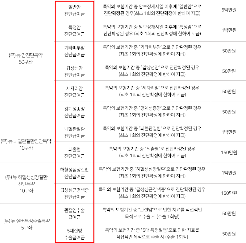 위의 이미지를 보시면 주계약은 급성심근경색증과 뇌출혈만 보장이 가능하고 나머지 사항들은 특약으로 구성이 되어있습니다. 일반암부터 중증치매진단 급여금까지 원하는 특약을 선택하여 가입하면 보장이 가능합니다.