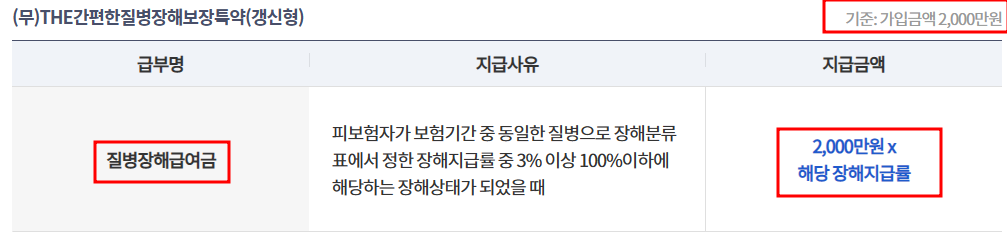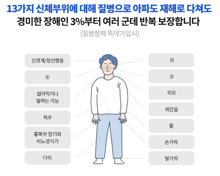 13가지 신체부위에 대해 질병으로 아파도 재해로 다쳐도 경미한 장해인 3%까지 질병장해 특약에 가입시 여러 군데를 반복적으로 보장이 가능하다고 합니다. 이러한 부분은 한 번의 치료로 끝나는 부분이 아니기 때문에 반복보장이 가능한 것 같습니다. 중대질환인 암이나 뇌졸중 등은 최초 1회에 한하여 지급합니다.