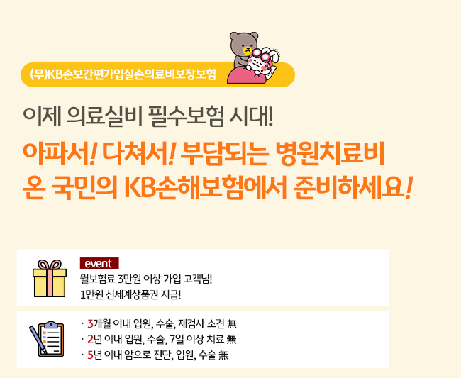 - KB손해보험 : 기본적인 질병과 상해만 보장이 가능하며 특약이 없습니다. 암, 뇌질환 같은 중대성 질환은 따로 보험에 가입해야 하며 현재 가입이벤트를 진행 중입니다.