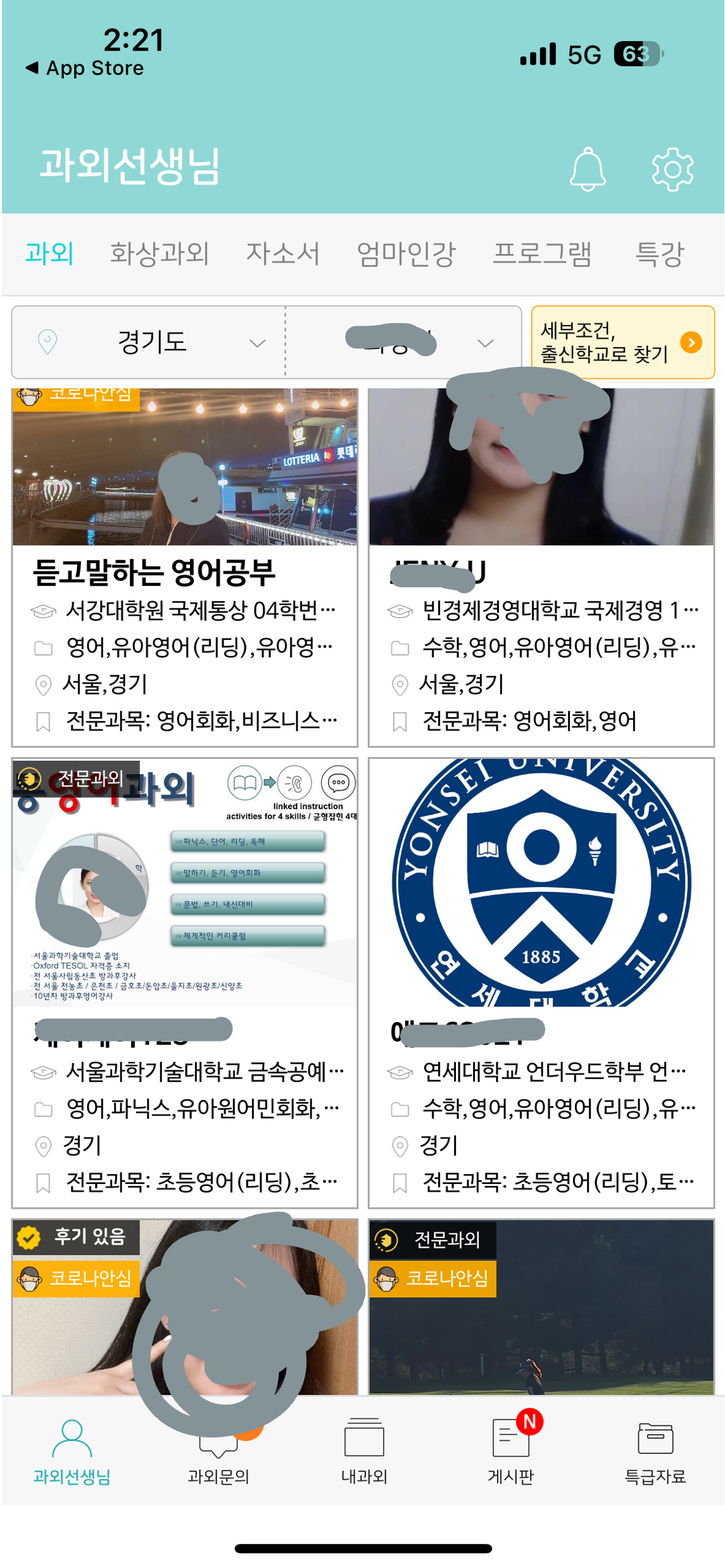 이 과정이 끝나면 김과외 어플의 가입이 끝났습니다. 그다음 안내 화면을 모두 읽어보시고 넘기면 내가 선택한 과목과 지역, 과외시간에 맞는 과외선생님들이 한 화면에 나타납니다.