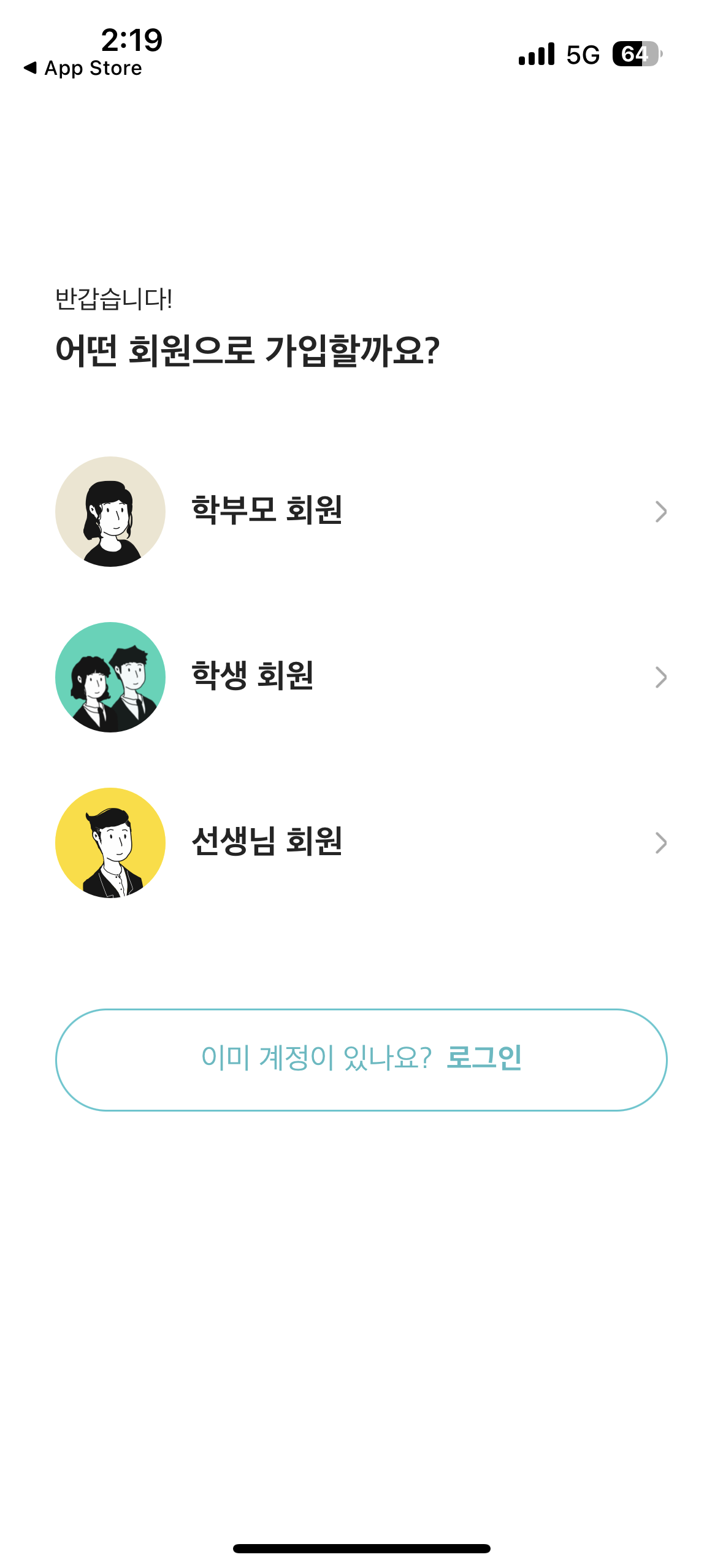 김과외 어플을 다운 후 실행시키면 아래와 같은 화면이 뜹니다. 가입하고자 하는 대상을 선택하시면 됩니다.