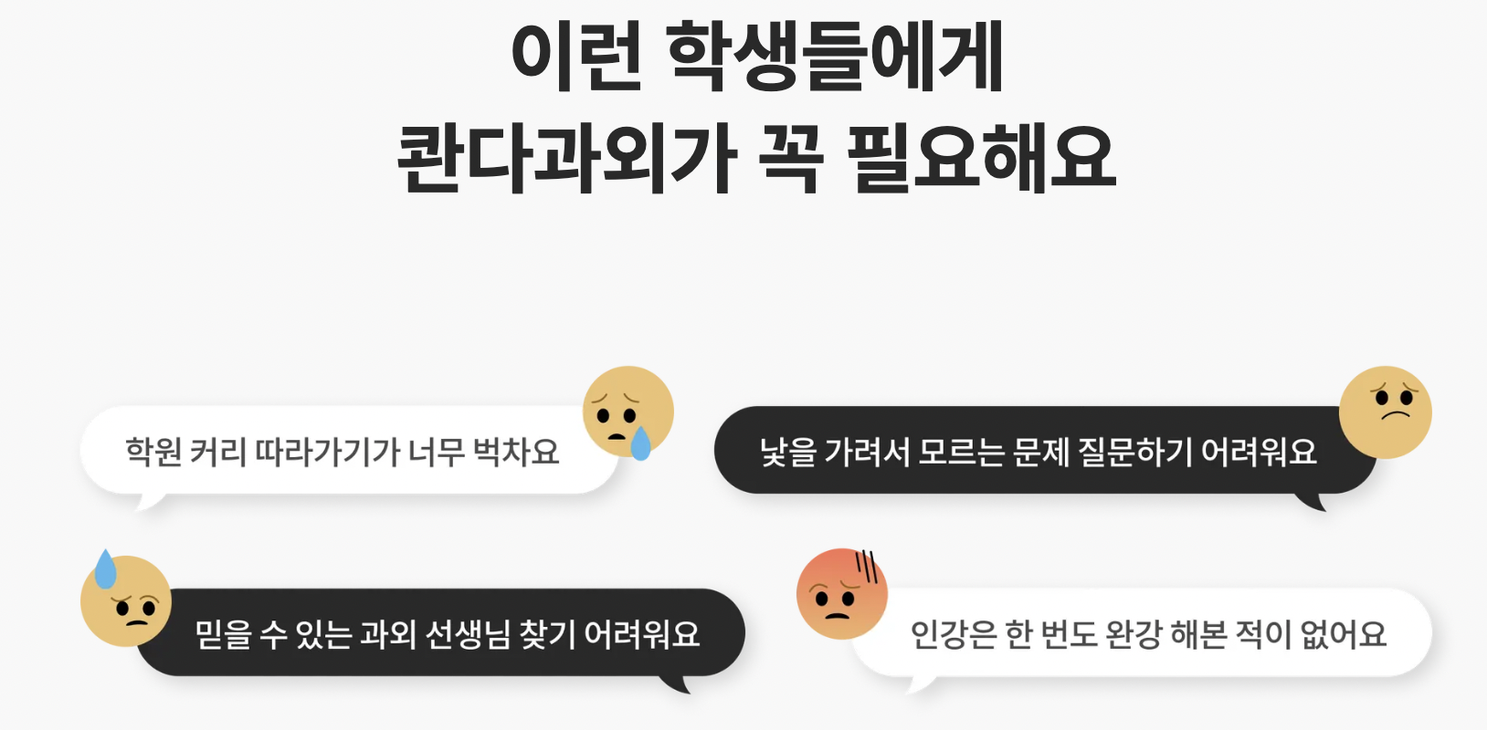 콴다과외는 학원 커리큘럼을 따라가기 힘든 경우, 낯가림이 심해 문제를 질문하기 어려운 학생, 믿을 수 있는 과외선생님을 찾기 어려운 경우, 인강을 한 번도 완강해본 적 없는 학생들에게 적합한 온라인 과외라고 합니다.